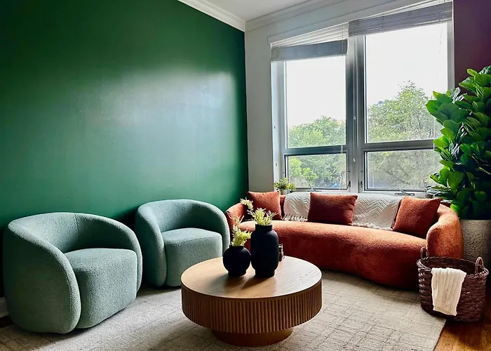 Die Ferienwohnung Gym Garage Parking Balcony Sleeps 4 bietet eine voll ausgestattete Küche, die einen Herd und einen Geschirrspüler bereitstellt. Die Apartments ist ungefähr 200 Meter von der Bushaltestelle Madison & Throop und ungefähr 500 Meter von der U-Bahn-Station Racine entfernt. Genießen Sie Ihren Aufenthalt auf einer Terrasse.